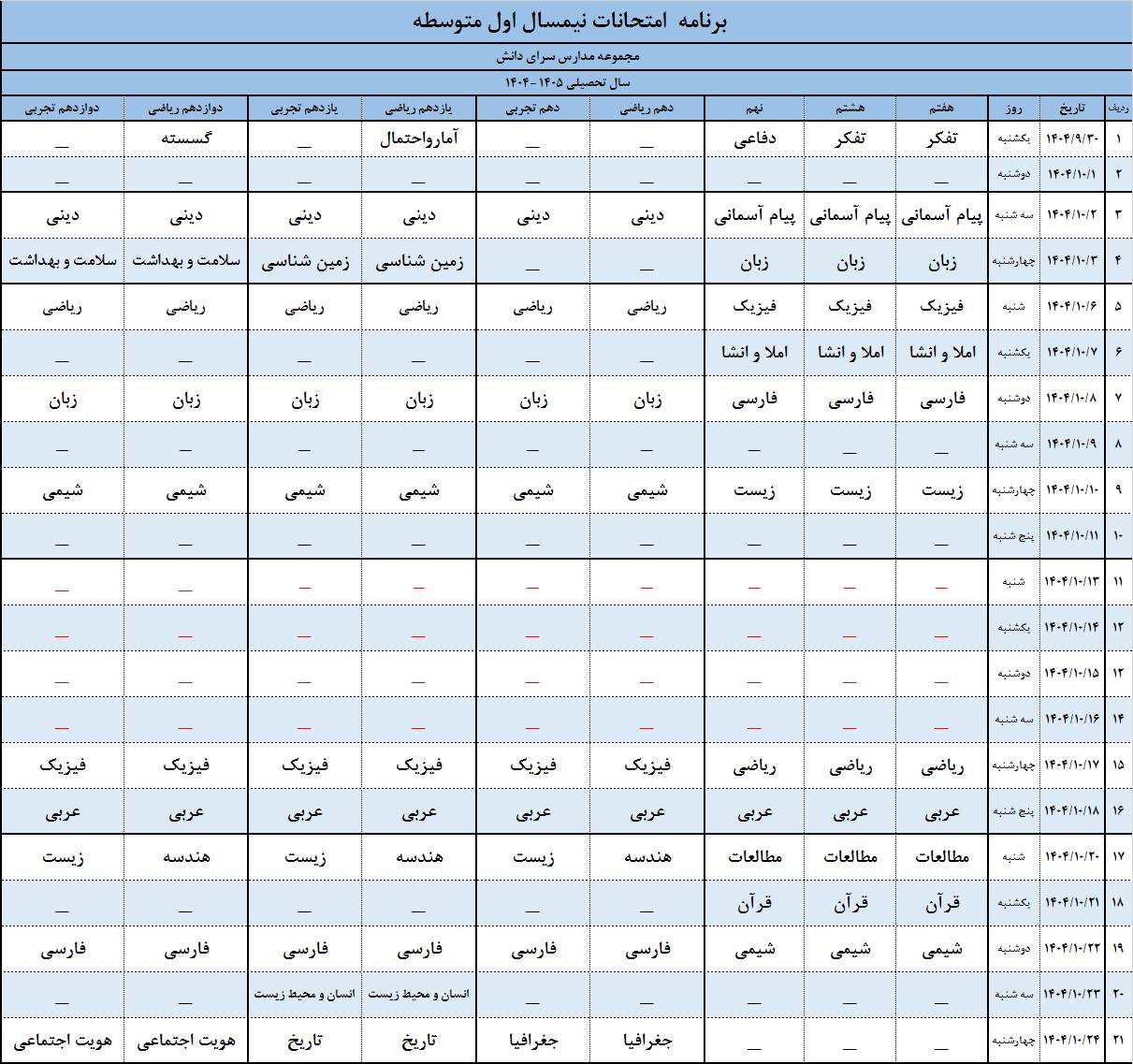 مطهره طاهری 6 دی 1404 برنامه امتحانات نیمسال اول متوسطه دوره اول و دوره دوم دی 1404 دانلود فایل 👁 تعداد بازدید: 9 فضای مجازی :